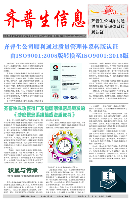 齐普生成功获得广东省国家保密局颁发的 《涉密信息系统集成资质证书》