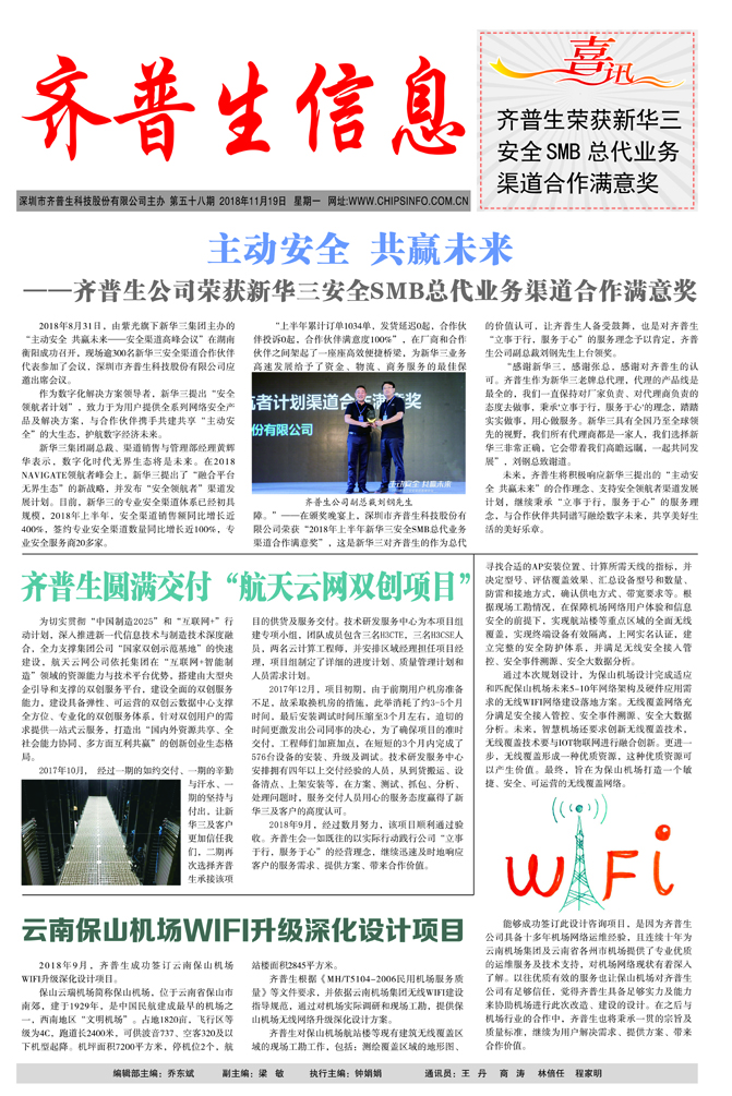主动安全 共赢未来 ——齐普生公司荣获新华三安全SMB总代业务渠道合作满意奖